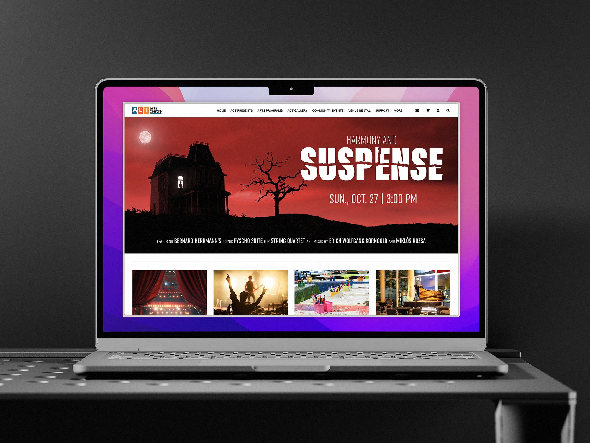 For this season, rather than focusing on a face that most patrons wouldn't recognize, we wanted to highlight the themes within the music. In this case, the featured piece was Bernard Herrmann's Psycho Suite for String Quartet from Hitchcock's Pyscho. We decided the key art for the show would be a realistic adaptation of the classic cover art from the film's original soundtrack. The show’s promotional materials showcased a cohesive visual identity across all formats, from print posters to our website and social media, ensuring consistent branding while meeting the specific requirements of each medium.