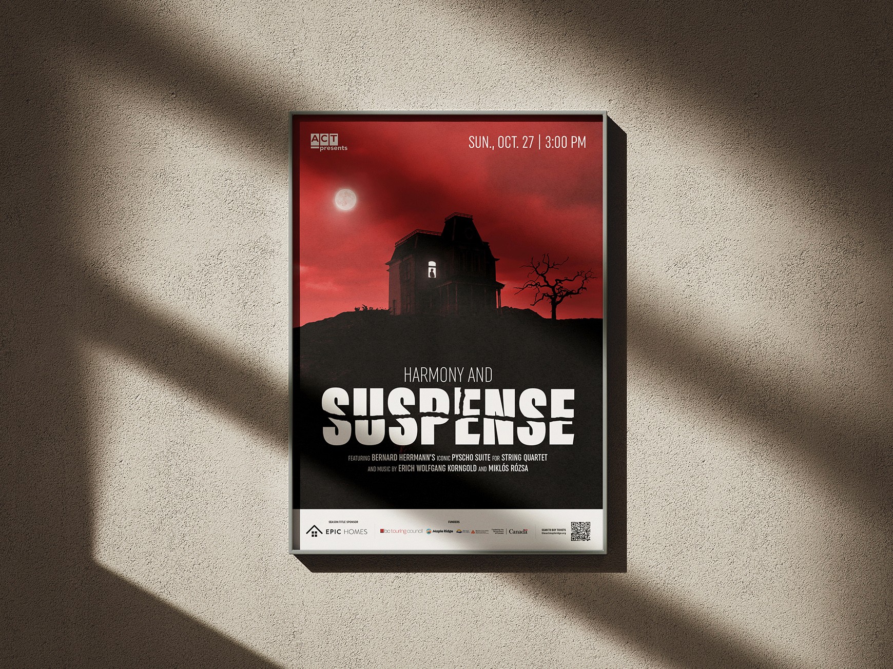 Below are the promotional assets for Harmony and Suspense, a show from the Sunday Chamber Music Series, which got a new look in the 2024–25 season. In past seasons, classical music shows had always been hard to sell. This can partially be attributed to the fact that they were originally advertised exclusively using an old photo of a composer alongside a sans serif title for the show.